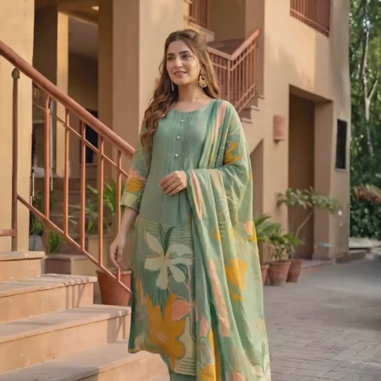 • Color: Sage Green Kurta/Pant with a Bold Multicolor Floral Print (featuring Orange, Peach, and Cream accents)