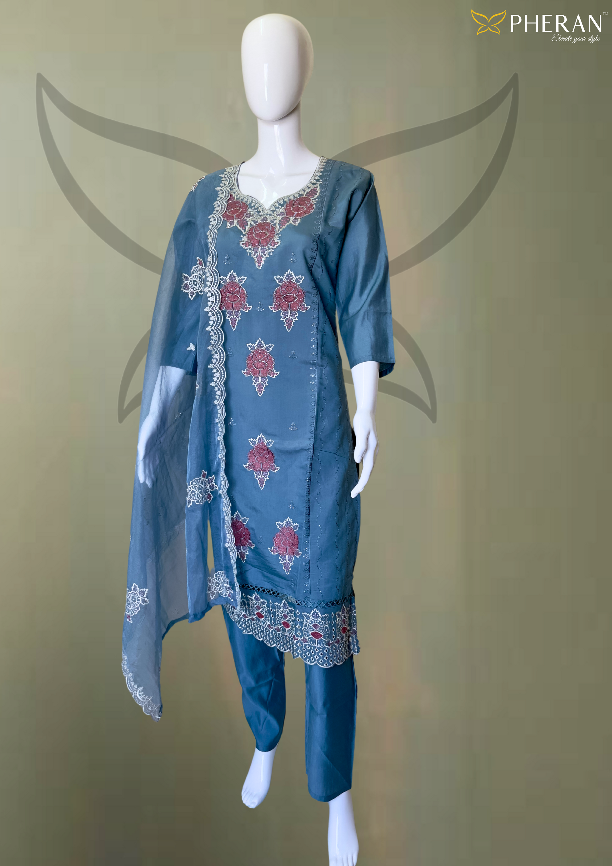 Pheran Premium Grey Floral Embroidered Kurta Set with Dupatta